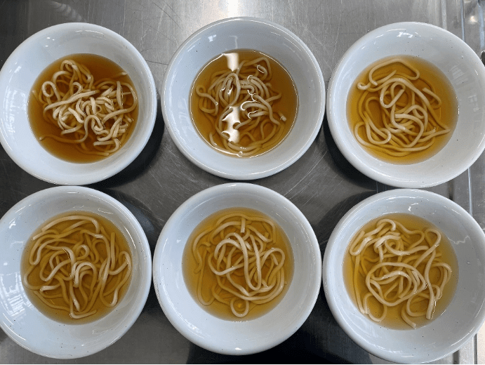 ヤマサのかつおつゆを薄めてうどんのつゆを作成し、つゆ:お湯の量を以下のように割り振って、味覚研究ラボのメンバーに食べ比べてもらいました。その後、最もおいしいと感じる区分を選んでもらいました。