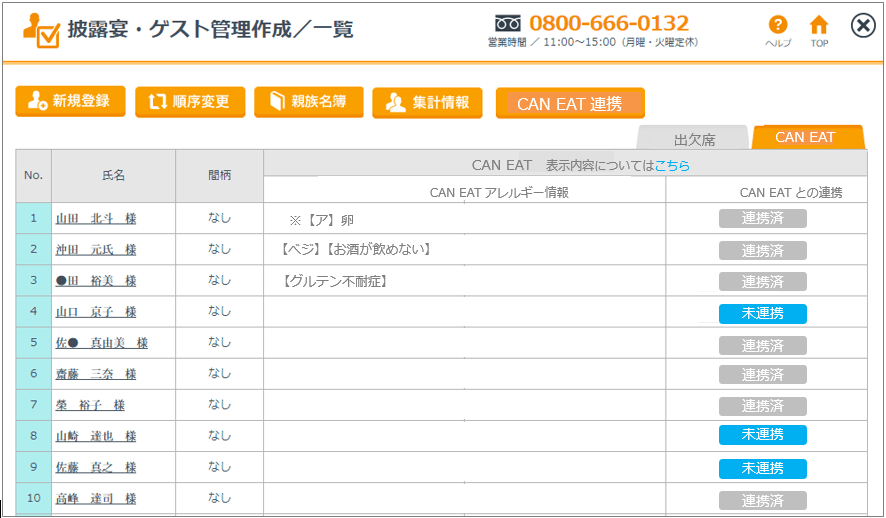 4.WPSの管理画面の「CAN EAT反映」ボタンを押下すると、名前をマッチングし、ゲストから入力された食事制限情報が配席表に自動で転記されます